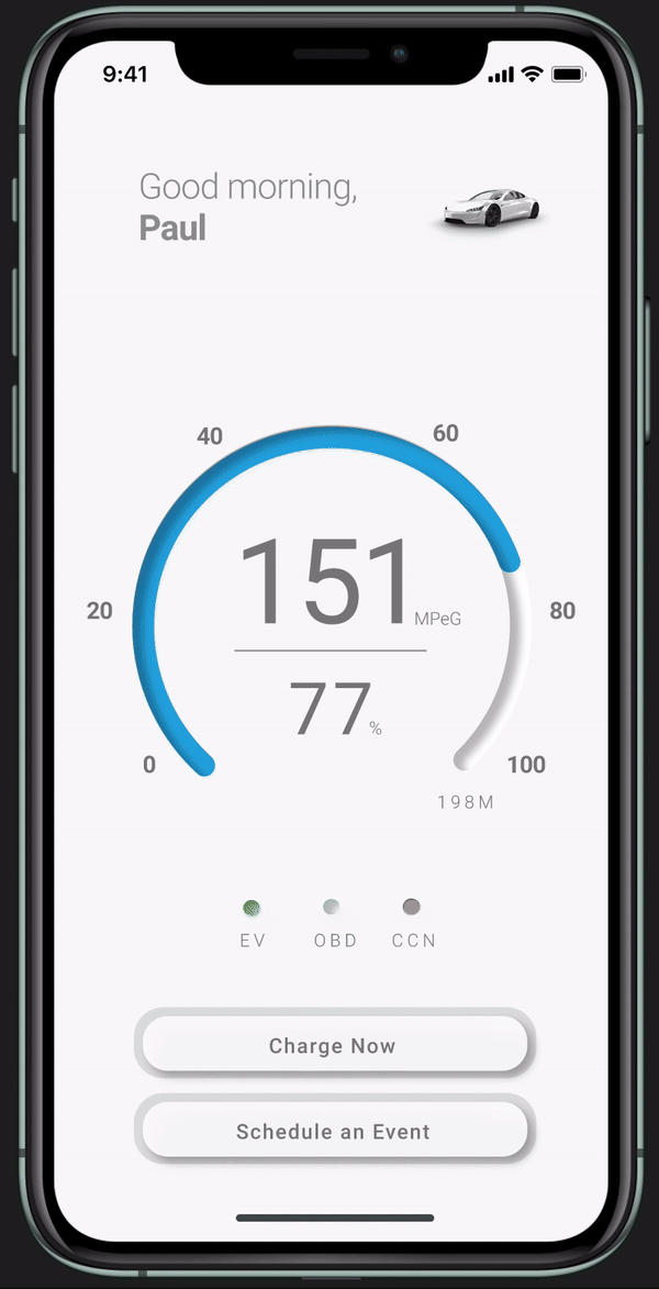 The dashboard functions dynamically so that once a user initiates a charge and all three devices are paired properly, the dial turns green to indicate their EV is happily charging. The two internal numbers change from mileage available to hours left til the charge is complete to provide users with greater transparency.